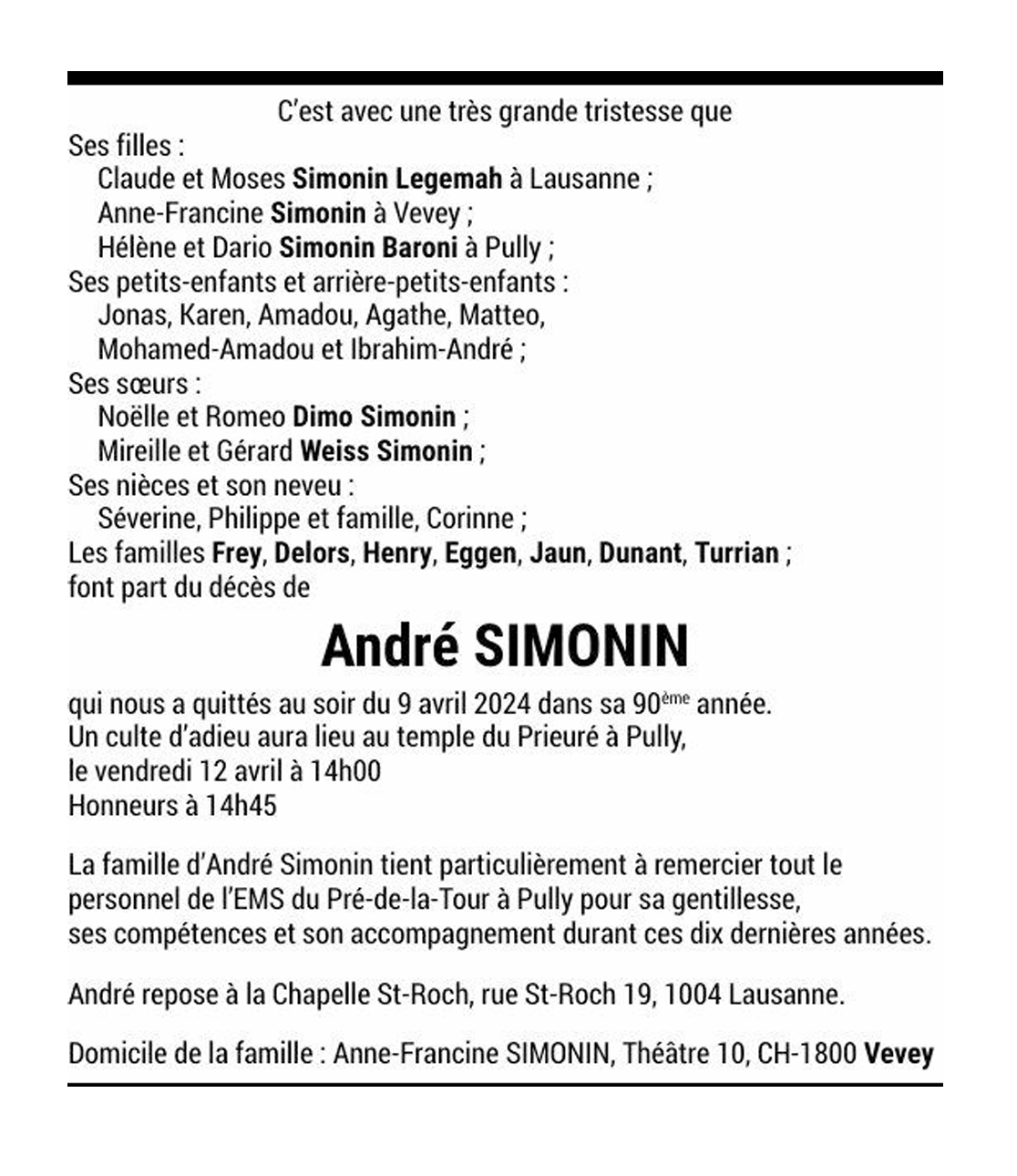 André SIMONIN 21 sep. 1934 - 09 avr. 2024 Avis mortuaire PFG Télecharger PDF Partager sur: Galerie PreviousNext PreviousNext