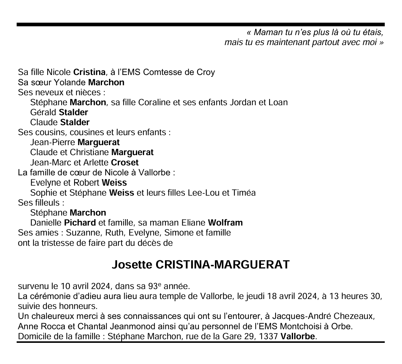 Josette CRISTINA-MARGUERAT 08 mai. 1931 - 10 avr. 2024 Avis mortuaire PFG Télecharger PDF Partager sur: Galerie PreviousNext PreviousNext