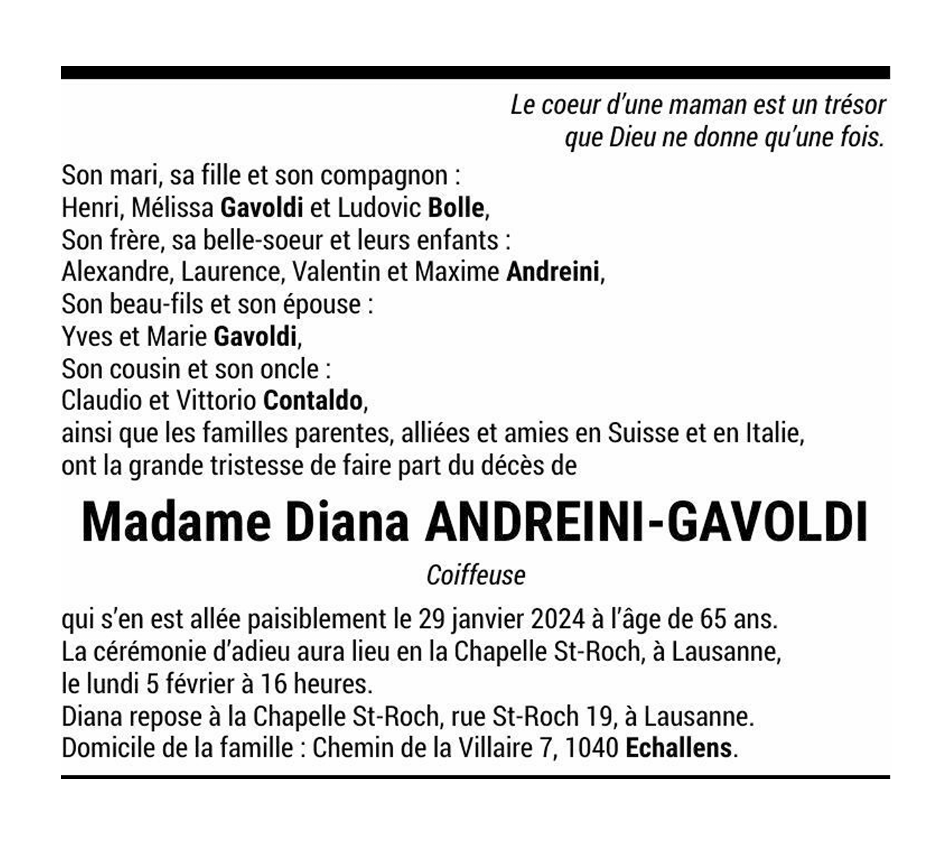 Madame Diana ANDREINI-GAVOLDI 19 déc. 1958 - 29 jan. 2024 Avis mortuaire PFG Télecharger PDF Partager sur: Galerie PreviousNext PreviousNext