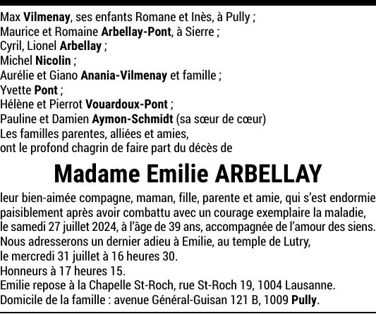 Madame Emilie ARBELLAY 23 mar. 1985 - 27 juil. 2024 Avis mortuaire PFG Partager sur: Galerie PreviousNext PreviousNext