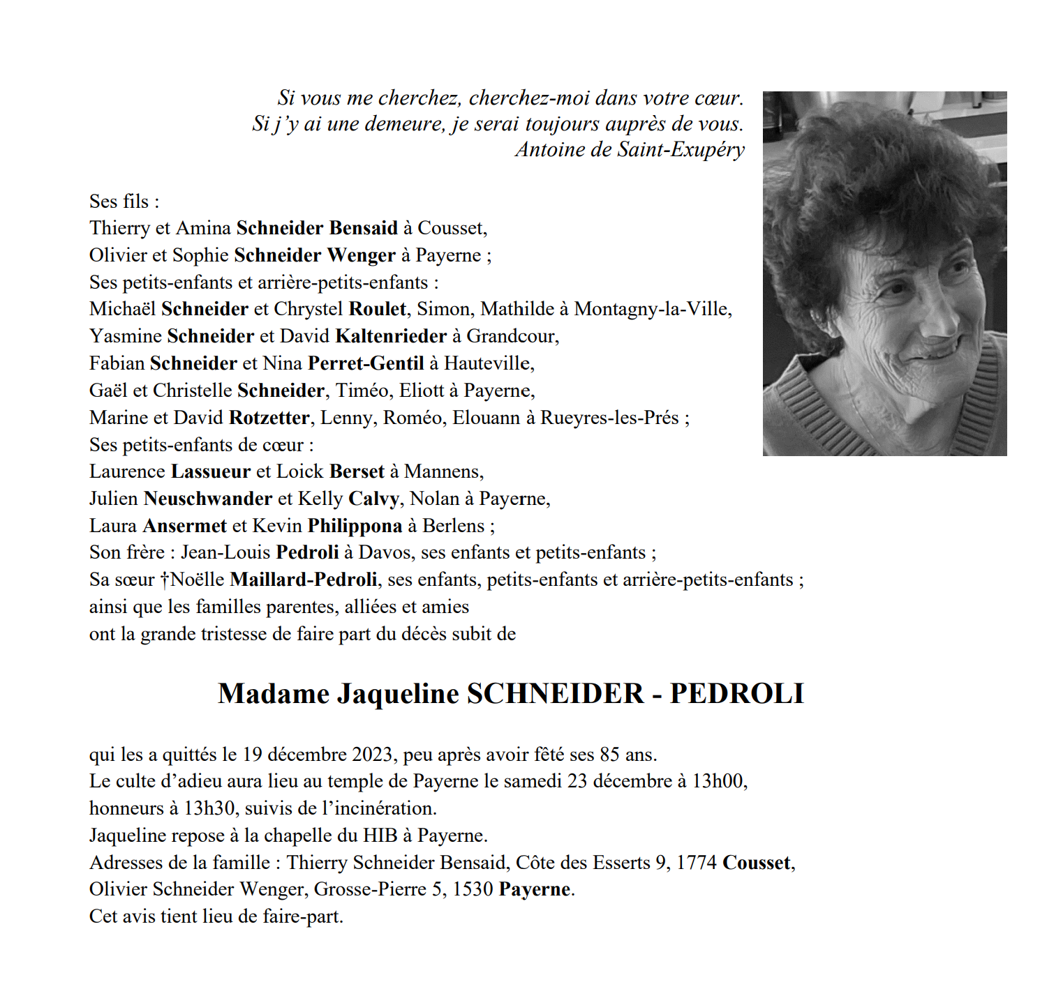 Madame Jaqueline SCHNEIDER - PEDROLI 08 déc. 1938 - 20 déc. 2023 Avis mortuaire PFG Télecharger PDF Partager sur: Galerie PreviousNext PreviousNext