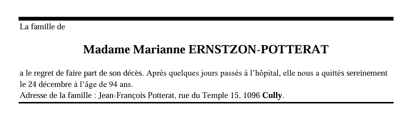 Madame Marianne ERNSTZON-POTTERAT 08 déc. 1929 - 23 déc. 2023 Avis mortuaire PFG Télecharger PDF Partager sur: Galerie PreviousNext PreviousNext