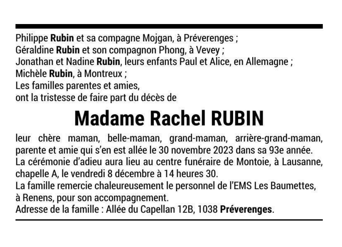 Madame Rachel RUBIN 15 juil. 1931 - 30 nov. 2023 Avis mortuaire PFG Télecharger PDF Partager sur: Galerie PreviousNext PreviousNext