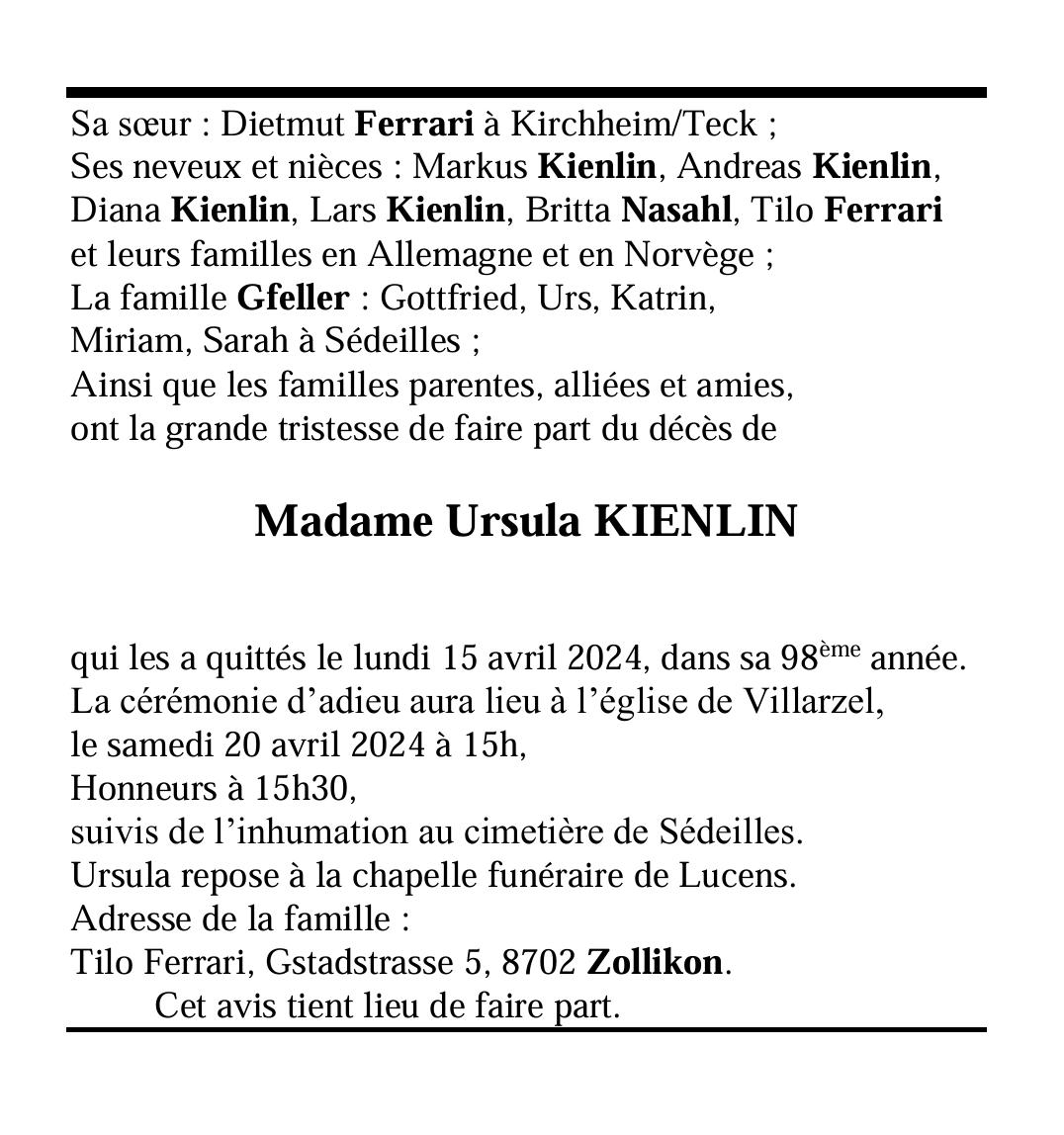 Madame Ursula KIENLIN 01 sep. 1926 - 15 avr. 2024 Avis mortuaire PFG Télecharger PDF Partager sur: Galerie PreviousNext PreviousNext