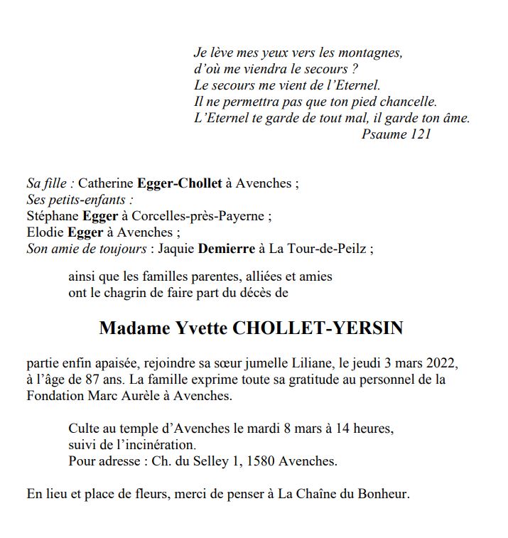 Madame Yvette CHOLLET-YERSIN 20 jan. 1935 - 03 mar. 2022 Avis mortuaire PFG Télecharger PDF Partager sur: Galerie PreviousNext PreviousNext