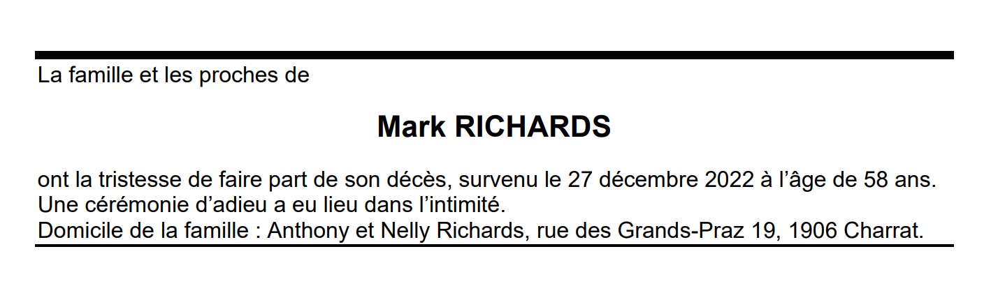 Mark RICHARDS 15 déc. 1964 - 27 déc. 2022 Avis mortuaire PFG Télecharger PDF Partager sur: Galerie PreviousNext PreviousNext