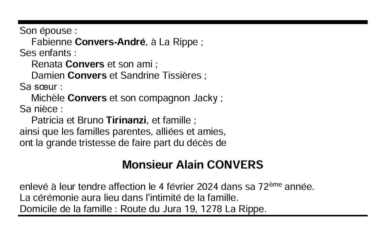 Monsieur Alain CONVERS 02 aoû. 1952 - 04 fév. 2024 Avis mortuaire PFG Télecharger PDF Partager sur: Galerie PreviousNext PreviousNext