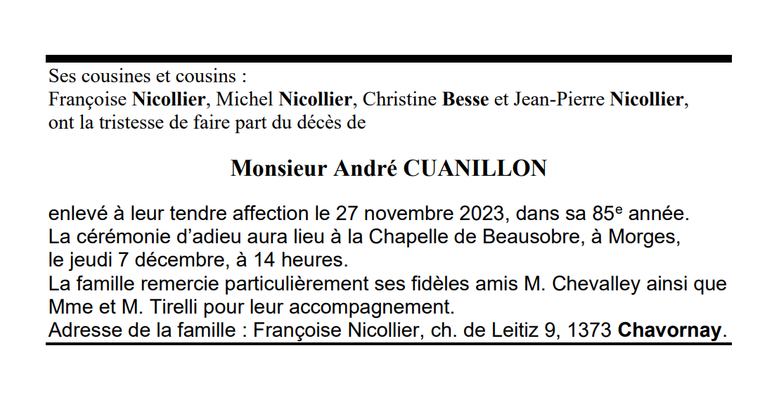 Monsieur André CUANILLON 10 avr. 1939 - 27 nov. 2023 Avis mortuaire PFG Télecharger PDF Partager sur: Galerie PreviousNext PreviousNext