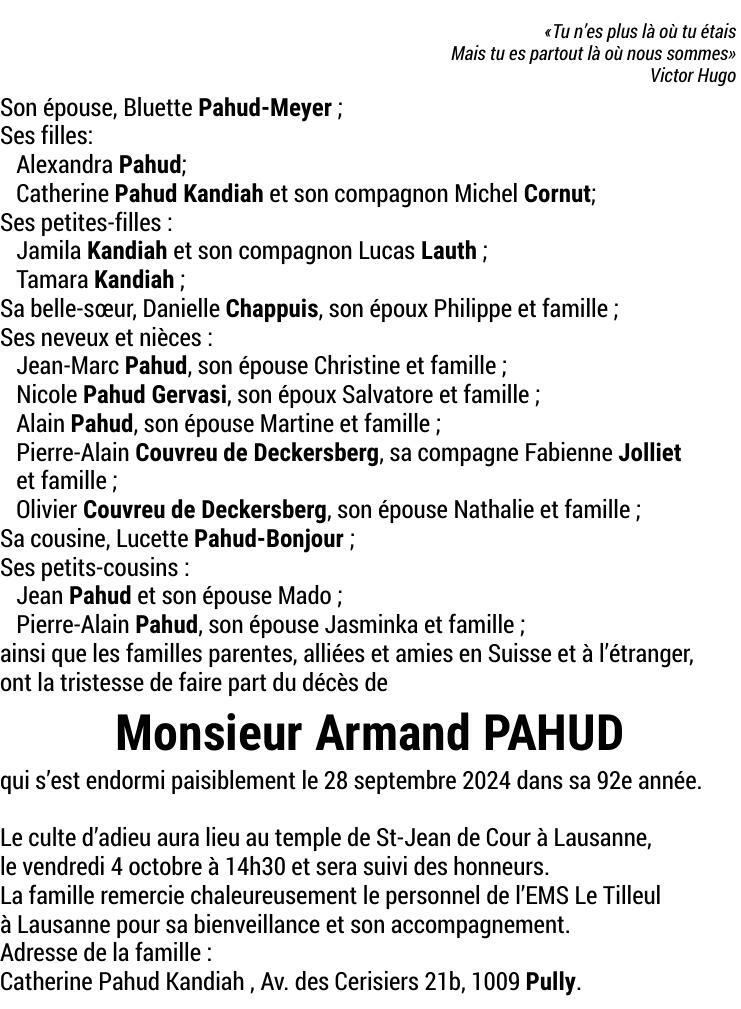 Monsieur Armand PAHUD 06 déc. 1932 - 28 sep. 2024 Avis mortuaire PFG Partager sur: Galerie PreviousNext PreviousNext