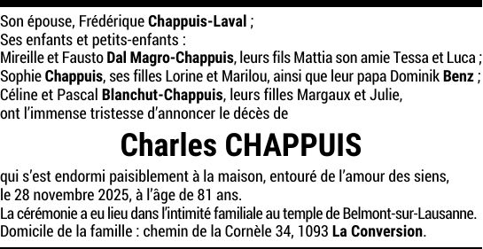 Monsieur Charles CHAPPUIS 01 aoû. 1944 - 28 nov. 2025 Avis mortuaire PFG Partager sur: Galerie PreviousNext PreviousNext