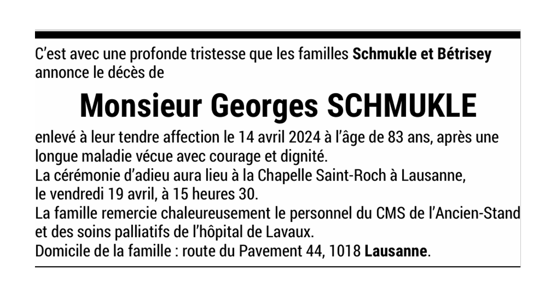 Monsieur Georges SCHMUKLE 20 fév. 1941 - 14 avr. 2024 Avis mortuaire PFG Télecharger PDF Partager sur: Galerie PreviousNext PreviousNext