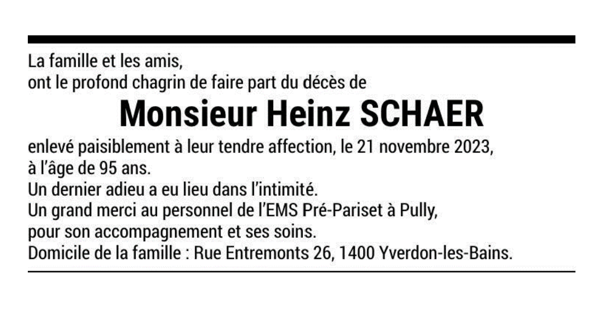 Monsieur Heinz SCHAER 13 sep. 1938 - 21 nov. 2023 Avis mortuaire PFG Télecharger PDF Partager sur: Galerie