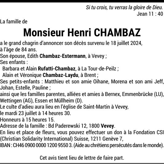 Monsieur Henri CHAMBAZ 30 avr. 1940 - 18 juil. 2024 Avis mortuaire PFG Partager sur: Galerie PreviousNext PreviousNext
