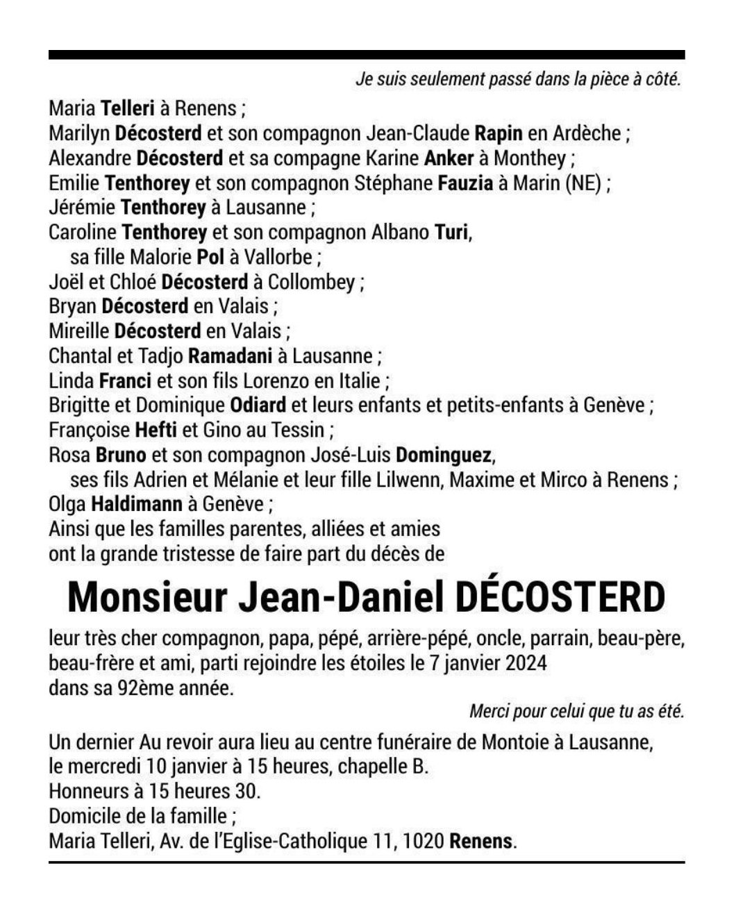 Monsieur Jean-Daniel DÉCOSTERD 17 aoû. 1932 - 07 jan. 2024 Avis mortuaire PFG Télecharger PDF Partager sur: Galerie PreviousNext PreviousNext