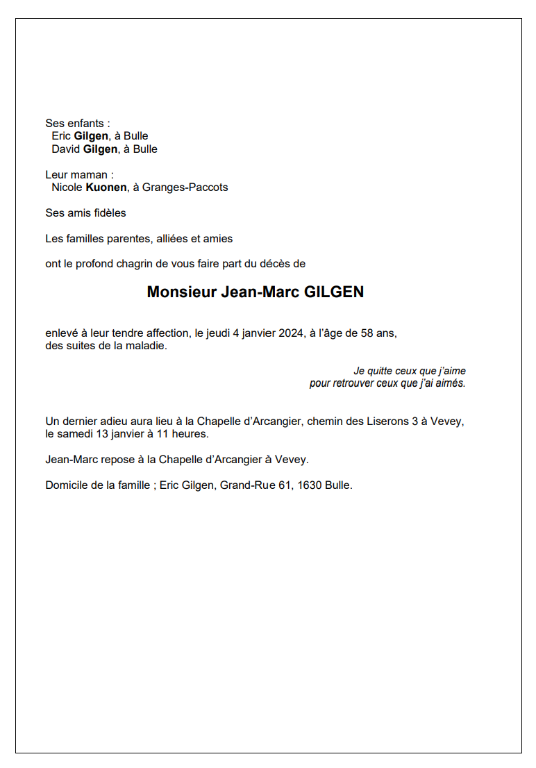Monsieur Jean-Marc GILGEN 16 juin. 1965 - 04 jan. 2024 Avis mortuaire PFG Télecharger PDF Partager sur: Galerie PreviousNext PreviousNext