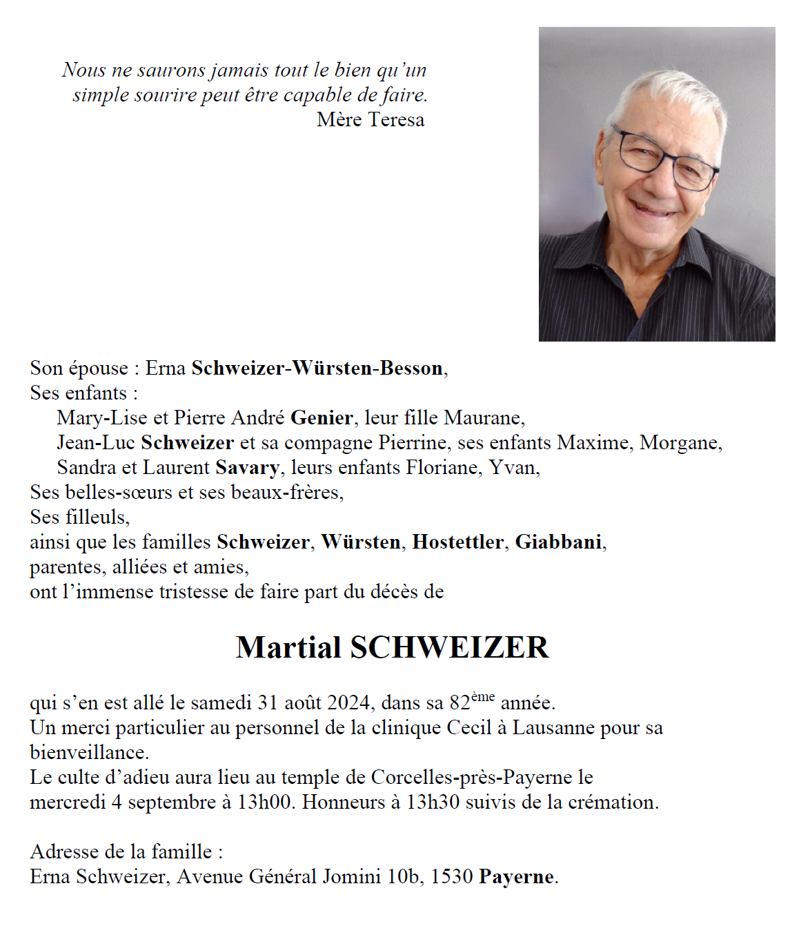 Monsieur Martial SCHWEIZER 12 déc. 1942 - 31 aoû. 2024 Avis mortuaire PFG Télecharger PDF Partager sur: Galerie PreviousNext PreviousNext