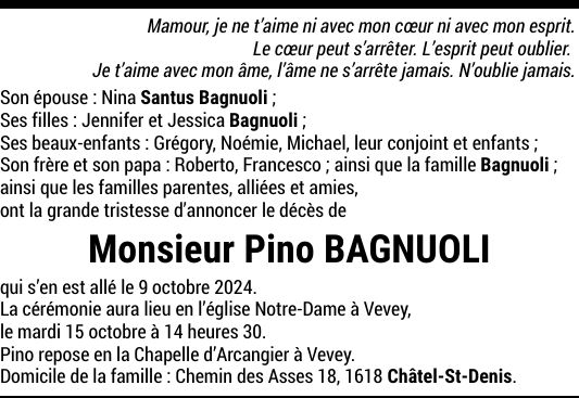 Monsieur Pino BAGNUOLI 25 oct. 1964 - 09 oct. 2024 Avis mortuaire PFG Partager sur: Galerie PreviousNext PreviousNext