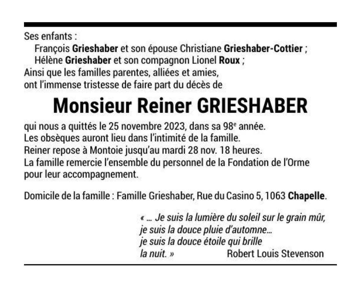 Monsieur Reiner GRIESHABER 05 nov. 1925 - 25 nov. 2023 Avis mortuaire PFG Télecharger PDF Partager sur: Galerie PreviousNext PreviousNext