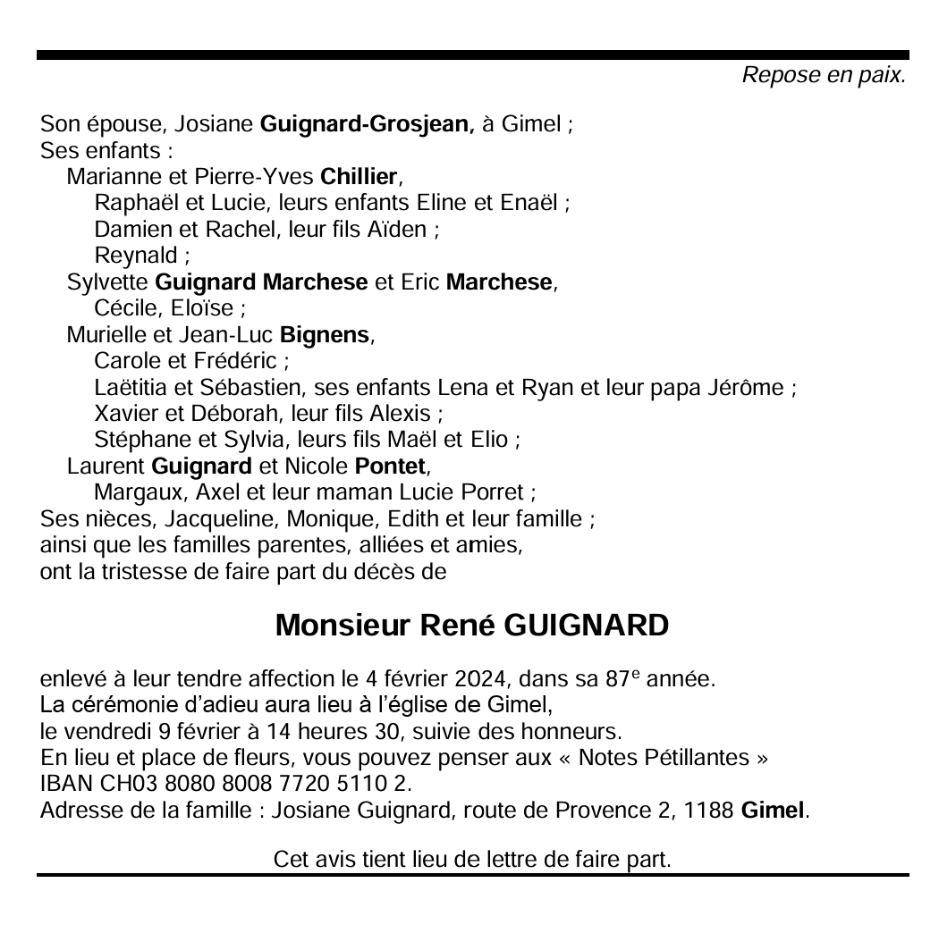 Monsieur René GUIGNARD 08 aoû. 1937 - 04 fév. 2024 Avis mortuaire PFG Télecharger PDF Partager sur: Galerie PreviousNext PreviousNext