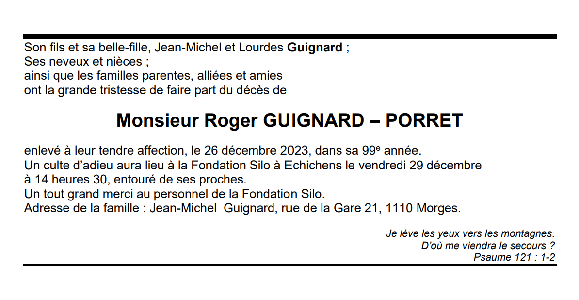 Monsieur Roger GUIGNARD – PORRET 10 sep. 1925 - 26 déc. 2023 Avis mortuaire PFG Télecharger PDF Partager sur: Galerie PreviousNext PreviousNext