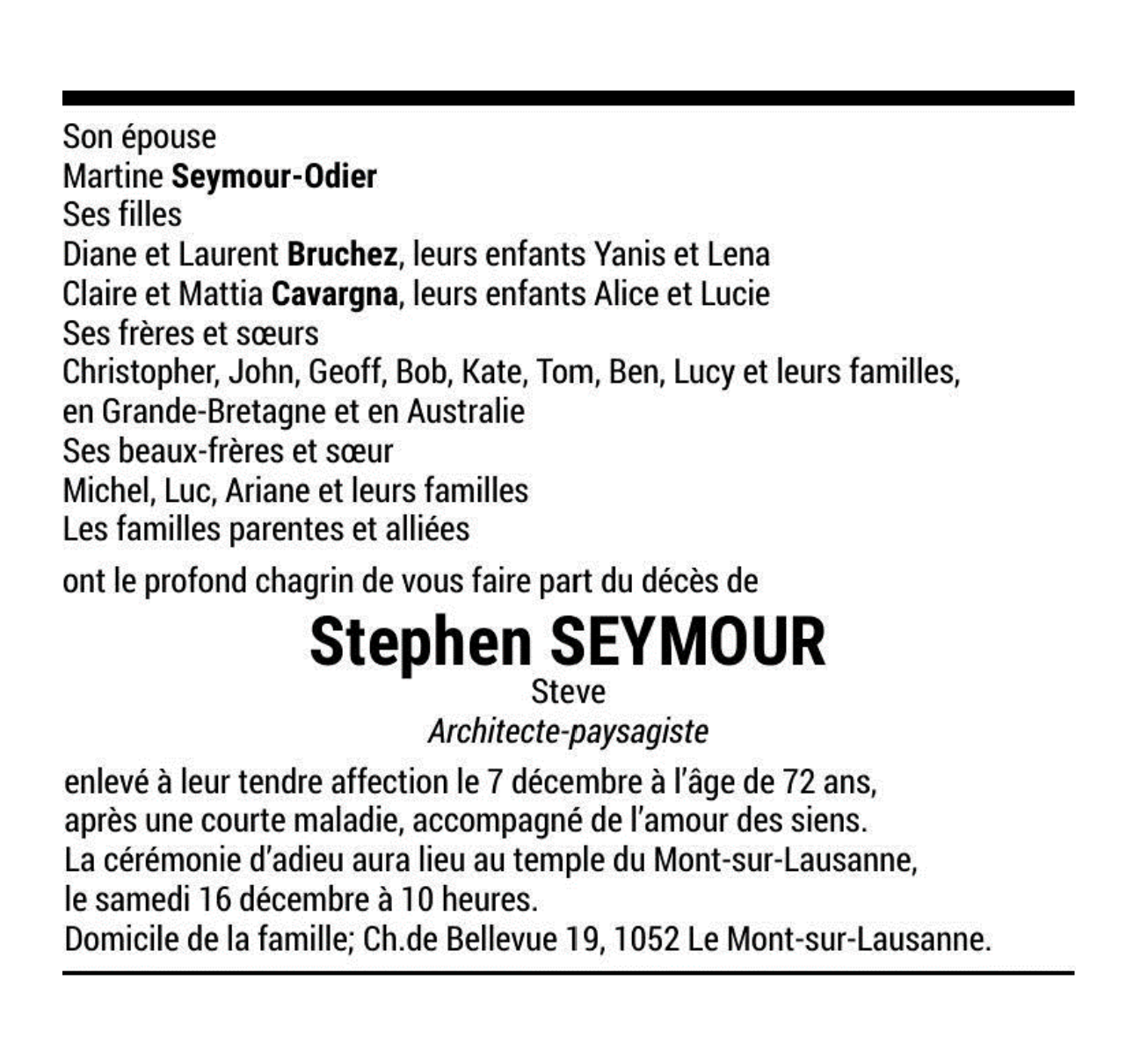 Stephen SEYMOUR, Steve Architecte-paysagiste 05 aoû. 1951 - 07 déc. 2023 Avis mortuaire PFG Télecharger PDF Partager sur: Galerie PreviousNext PreviousNext